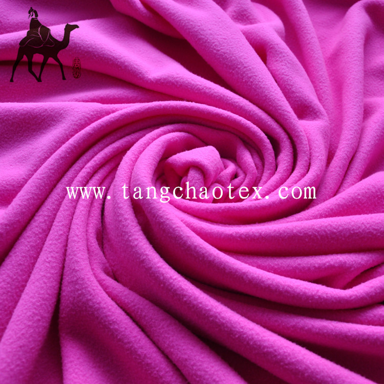 搖粒絨是針織面料的一種,它是小元寶針織結(jié)構(gòu),在大圓機編織而成,織成后坯布先經(jīng)染色,再經(jīng)拉毛、梳毛、剪毛、搖粒等多種復(fù)雜工藝加工處理,面料正面拉 毛,搖粒蓬松密集而又不易掉毛、起球,反面拉毛疏稀勻稱,絨毛短少,組織紋理清晰、蓬松彈性特好。它的成份一般是全滌的,手感柔軟。
