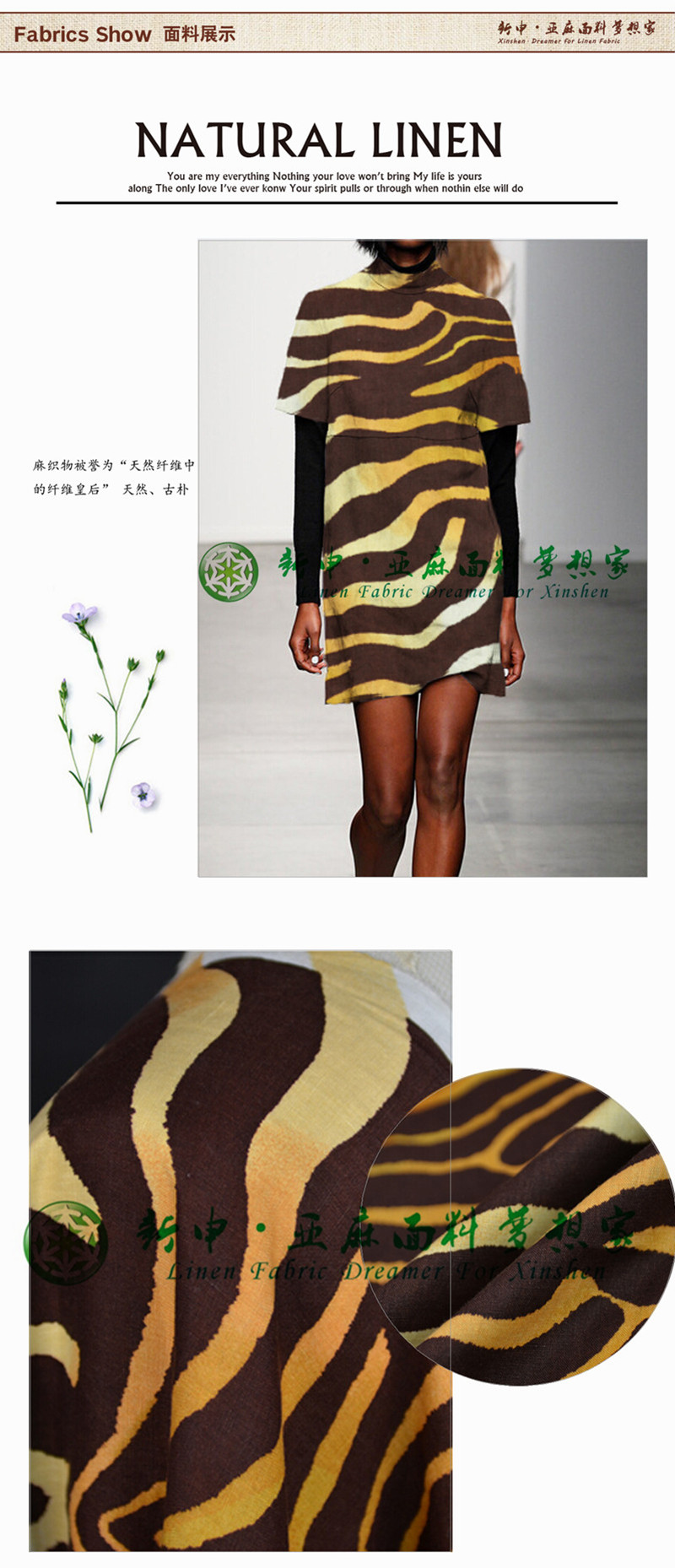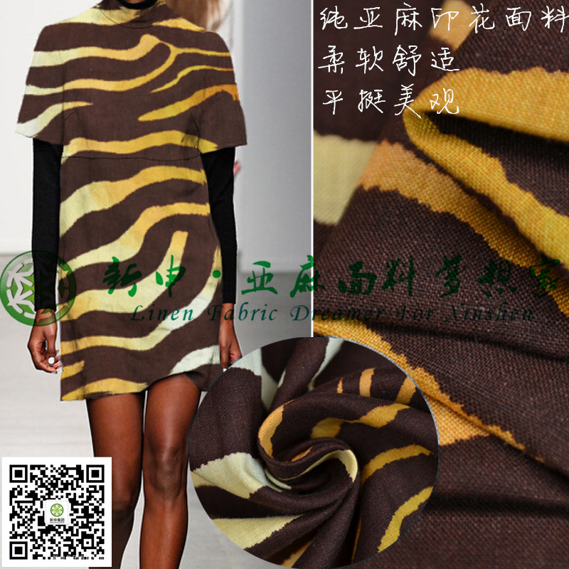 新款時尚純亞麻豹紋印花女裝連衣裙面料