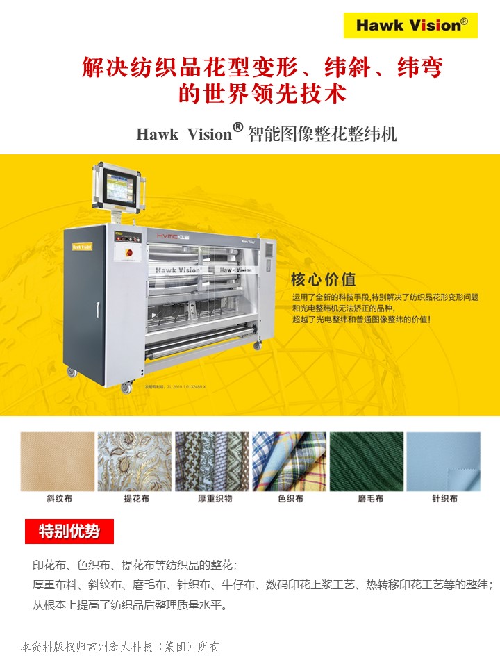 Hawk Vision 智能圖像整花整緯機(jī)一體機(jī),是“霍克威視”品牌依托其強(qiáng)大的歐洲技術(shù)背景和常州宏大深厚的技術(shù)研發(fā)實(shí)力,首創(chuàng)國際領(lǐng)先的“全幅掃描整花整緯技術(shù)”,全幅掃描可大于8000個(gè)監(jiān)測點(diǎn),徹底解決了光電整緯無法矯正和識別的紡織品花型變形、緯斜、緯彎問題,超越了光電整緯和普通圖像整緯的價(jià)值!系統(tǒng)具有廣泛的品種適應(yīng)性,除了適用于光電整緯的全部品種,還適應(yīng)光電整緯無法正常識別和矯正的品種,如色織布、提花布、厚重織物、斜紋布、磨毛布、針織布、牛仔布、印花布等,大大提高了紡織品后整理質(zhì)量水平,實(shí)現(xiàn)了紡織品智能整花、整緯的革命性突破,開啟了紡織品整花、整緯的新時(shí)代!該裝備已在國內(nèi)多家優(yōu)秀企業(yè)成功使用,收效顯著,提升了企業(yè)的市場競爭力,為客戶創(chuàng)造了核心價(jià)值。