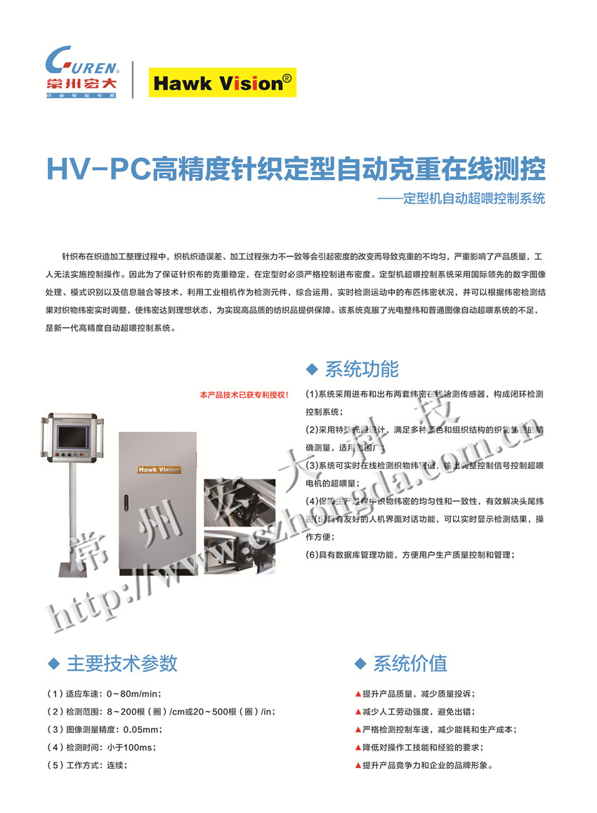 定型機超喂控制系統(tǒng)采用國際領(lǐng)先的數(shù)字圖像處理、模式識別以及信息融合等技術(shù),利用工業(yè)相機作為檢測元件,綜合運用,實時檢測運動中布匹緯密狀況,并可以根據(jù)緯密檢測結(jié)果對織物緯密實時調(diào)整,使緯密達(dá)到理想狀態(tài),為實現(xiàn)高品質(zhì)的紡織品提供保障。該系統(tǒng)克服了光電超喂和普通圖像自動超喂系統(tǒng)的不足。