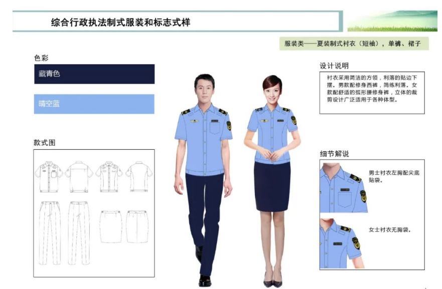 說明:襯衫為滌棉混紡面料,顏色為藍色,短袖襯衫為立領(lǐng),單排四粒扣,兩個明口袋。長袖襯衫為立領(lǐng),單排五???,兩個明口袋;西服簡褲為滌棉混紡面料或公安面料。