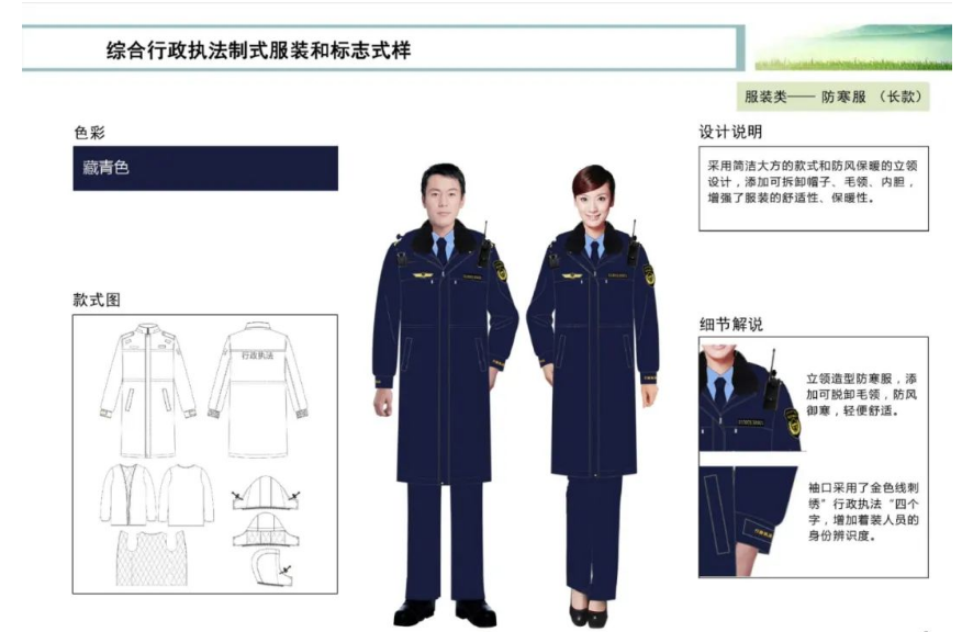 應(yīng)急管理綜合行政執(zhí)zhifa制式服裝和標志包括帽類、服裝類、鞋類、標志類等4大類18小類。主色調(diào)為藏青色,臂章通用圖案由盾牌、松枝及“中華人民共和國應(yīng)急管理zhifa”字樣組成,整體彰顯執(zhí)zhifa的權(quán)威性。盾牌內(nèi)圖案由五角星、齒輪、緊握的手、英文字母“EM”組成,象征應(yīng)急管理,整體表達堅持安全發(fā)展、維護人民群眾生命財產(chǎn)安全和社會穩(wěn)定的理念。