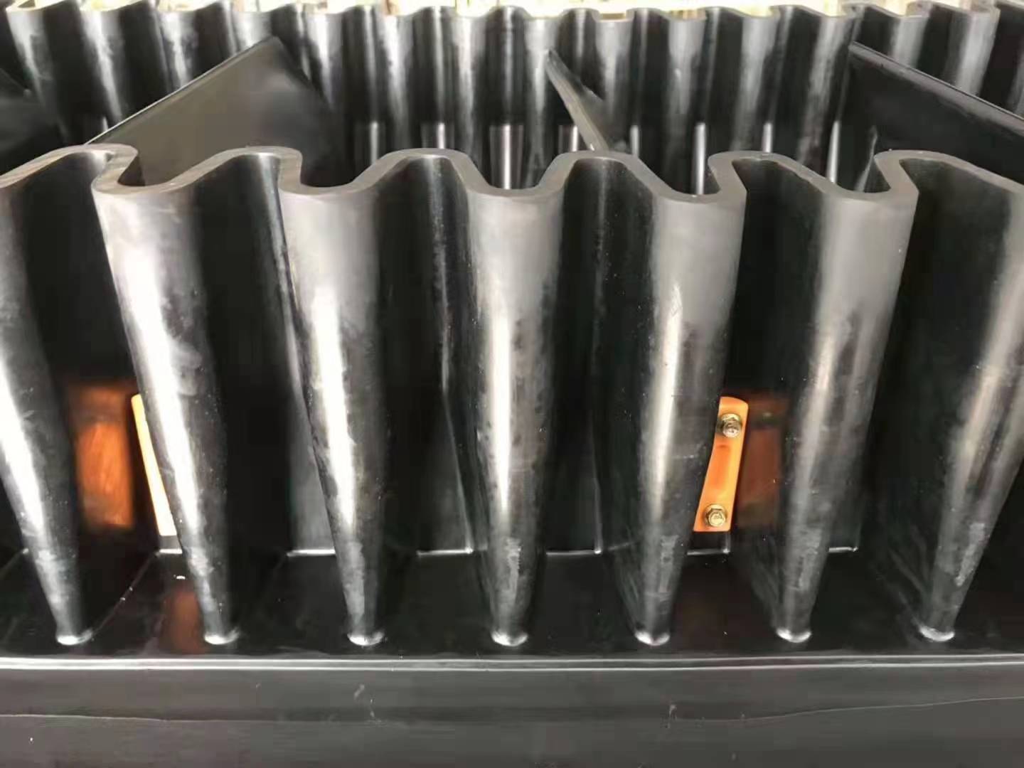 大傾角擋邊帶橫隔板與基帶的粘接采用二次低溫硫化粘接,粘接強(qiáng)度高,粘接平滑牢靠,不易掉板,不易脫落。橫隔板與波狀擋邊間采用螺栓連接加固,增加了整體鋼性和提高整體使用性能,解決了物料泄露的問題。