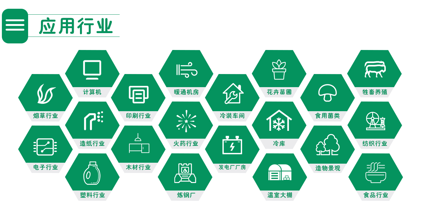 煙草行業(yè):像高煙葉柔韌性,含水率。 印刷行業(yè):除靜電,設(shè)備不卡紙,提高生產(chǎn)效率。 計(jì)算機(jī)房:恒溫系統(tǒng),除靜電,防止短路。暖通機(jī)房: 中央空調(diào)恒濕系統(tǒng),降溫省能耗、除靜電。食用菌種植:調(diào)節(jié)茹房濕度,促進(jìn)食用菌的生長(zhǎng),保證食用菌的穩(wěn)產(chǎn)高產(chǎn)。