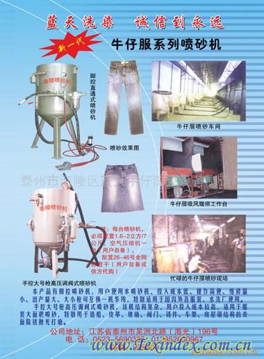 牛仔服噴砂機(jī) , 手檫機(jī),馬溜機(jī) 本機(jī)為流水線作業(yè),結(jié)構(gòu)簡便,方便維修,用戶投入成本較低,出產(chǎn)量大。適用于國內(nèi)各成衣洗水廠及服裝廠使用 牛仔褲噴砂機(jī)是利用壓縮空氣為動力,將棕剛玉砂噴射到牛仔褲上,能使牛仔褲起到