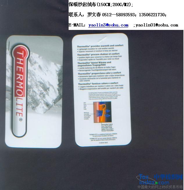 4)THERMOLITE(保暖紗)起絨布。并可做功能性后處理:抗靜電;抗菌;吸濕排汗。