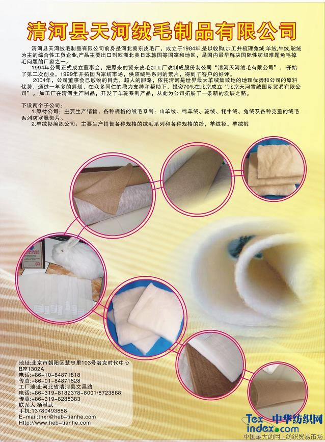 清河縣天河絨毛制品有限公司前身是河北冀東皮毛廠,成立于1984年。是以收購,加工并梳理兔絨,羊絨,牛絨,駝絨為主的綜合性工貿(mào)企業(yè),產(chǎn)品主要出口到歐洲北美日本韓國等國家和地區(qū),是國內(nèi)較早解決紡織難題兔毛掉毛問題的廠家之一。