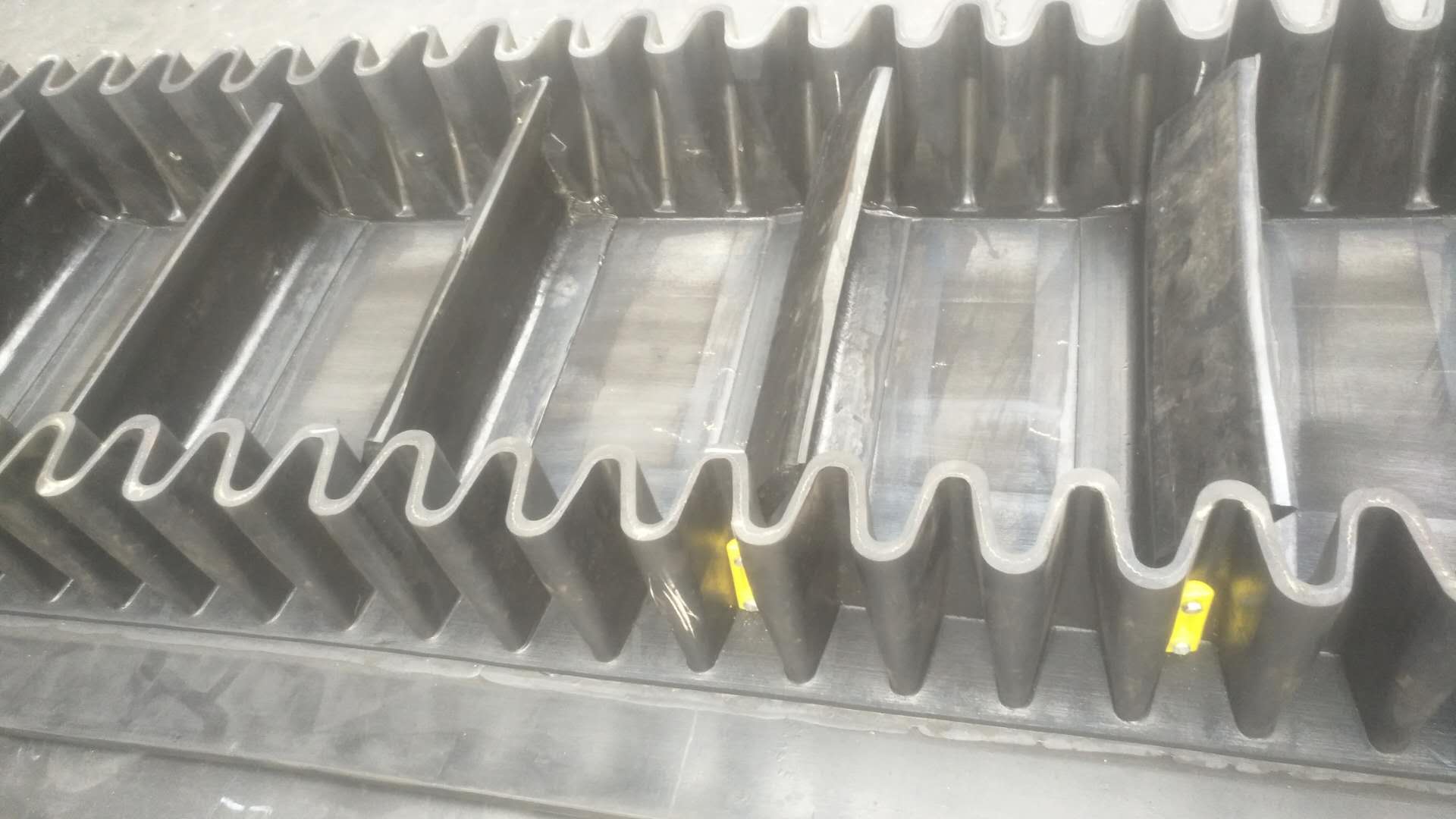 大傾角波狀擋邊帶由基帶、波紋擋邊、橫隔板3部分組成。擋邊起防止物料測(cè)滑撒落的作用。為便于繞過滾筒,檔邊設(shè)計(jì)成波紋狀;橫隔板的作用是承托物料,為了實(shí)現(xiàn)大傾角輸送,采用T型TC型設(shè)計(jì)。檔邊和橫隔板是用二次硫化的方法與基帶連接的,具有很高的連接強(qiáng)度。