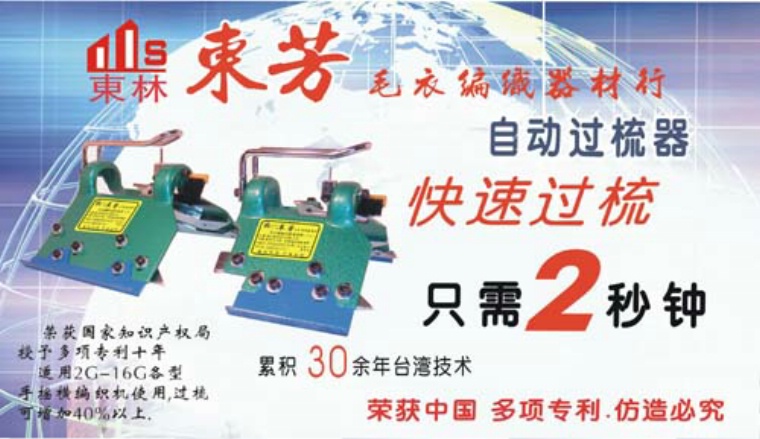 東芳毛衣編織器材行專業(yè)制造東林牌/東田牌毛衣編織自動(dòng)過梳器(亦稱:翻針器),產(chǎn)品在臺(tái)灣于1974年研究試產(chǎn),多年不斷的研究改進(jìn), 具有工業(yè)價(jià)值,更于1977年榮獲臺(tái)灣經(jīng)濟(jì)部中央標(biāo)準(zhǔn)局專利十年 (專利字第100010號(hào)) 專業(yè)制造過梳器已有三十余年經(jīng)驗(yàn).