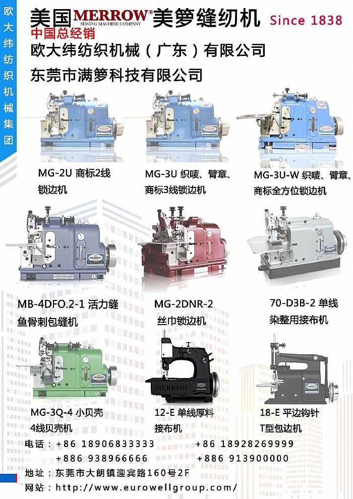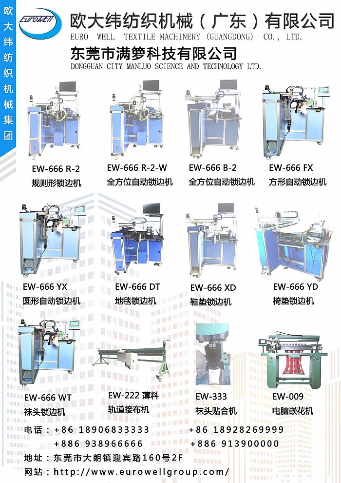 歐大緯紡織機(jī)械(廣東)有限公司系臺(tái)資企業(yè),創(chuàng)立于1981年,公司主要生產(chǎn)各類電腦針織機(jī)械,如全電腦嵌花機(jī),全電腦織襪機(jī),全電腦無(wú)縫針織內(nèi)衣機(jī),全電腦橫編機(jī),全電腦提花手套機(jī),染整用接布頭軌道機(jī),襪頭縫合機(jī),小圓機(jī)等等。同時(shí)代理美國(guó)Merrow公司包縫機(jī)一系列產(chǎn)品。