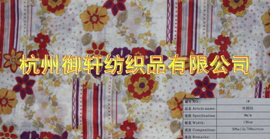 杭州御軒紡織品有限公司是專業(yè)生產(chǎn)印染經(jīng)營絲綢、絲棉類等產(chǎn)品的企業(yè)。公司擁有完整、科學(xué)的質(zhì)量管理體系,公司的誠信、實力和產(chǎn)品質(zhì)量獲得業(yè)界的認可。公司主要經(jīng)營1,全真絲印花、染色、色織服裝面料;2,絲綿、絲麻印花、染色、色織服裝面料;3,絲綢、仿真絲方巾及絲綢工藝品。