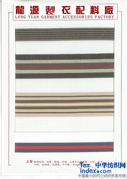 中山 龍源制衣配料有限公司成立于2001年,位于偉人的故鄉(xiāng)-中山.現(xiàn)有員工100多人,本公司承接各種服裝輔料的設計及生產,擁有一流專業(yè)設計師,專業(yè)市場人才,專門為您提供免費設計策劃方案,擁有專業(yè)先進設備,自主生產的能力;主要生產各種織帶.等制衣輔料,自設廠房.模具房,歡迎來樣加工或訂做 。